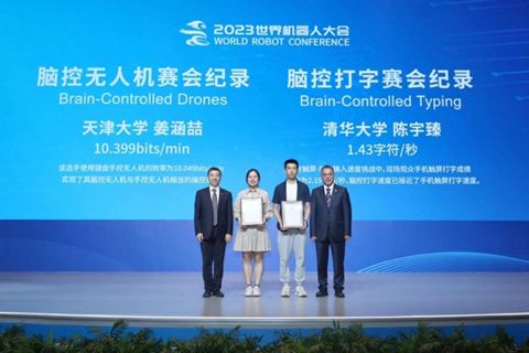北京市經(jīng)濟和信息化局黨組書記、局長姜廣智,北京經(jīng)濟技術(shù)開發(fā)區(qū)管委會主任孔磊本屆大會產(chǎn)生了兩項紀錄,分別是2023世界機器人大會腦控打字、腦控無人機賽會記錄,北京市經(jīng)濟和信息化局黨組書記、局長姜廣智,北京經(jīng)濟技術(shù)開發(fā)區(qū)管委會主任孔磊為兩項紀錄創(chuàng)造者頒發(fā)證書。