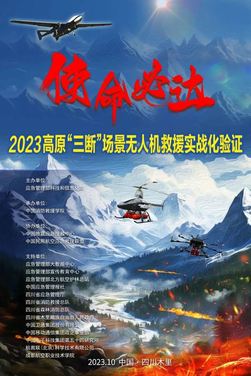 2023高原“三斷”場(chǎng)景無人機(jī)救援實(shí)戰(zhàn)化驗(yàn)證由應(yīng)急管理部科技和信息化司主辦,中國(guó)消防救援學(xué)院無人機(jī)應(yīng)急救援技術(shù)重點(diǎn)實(shí)驗(yàn)室承辦,中國(guó)地震應(yīng)急搜救中心、中國(guó)民用航空應(yīng)急救援聯(lián)盟協(xié)辦。